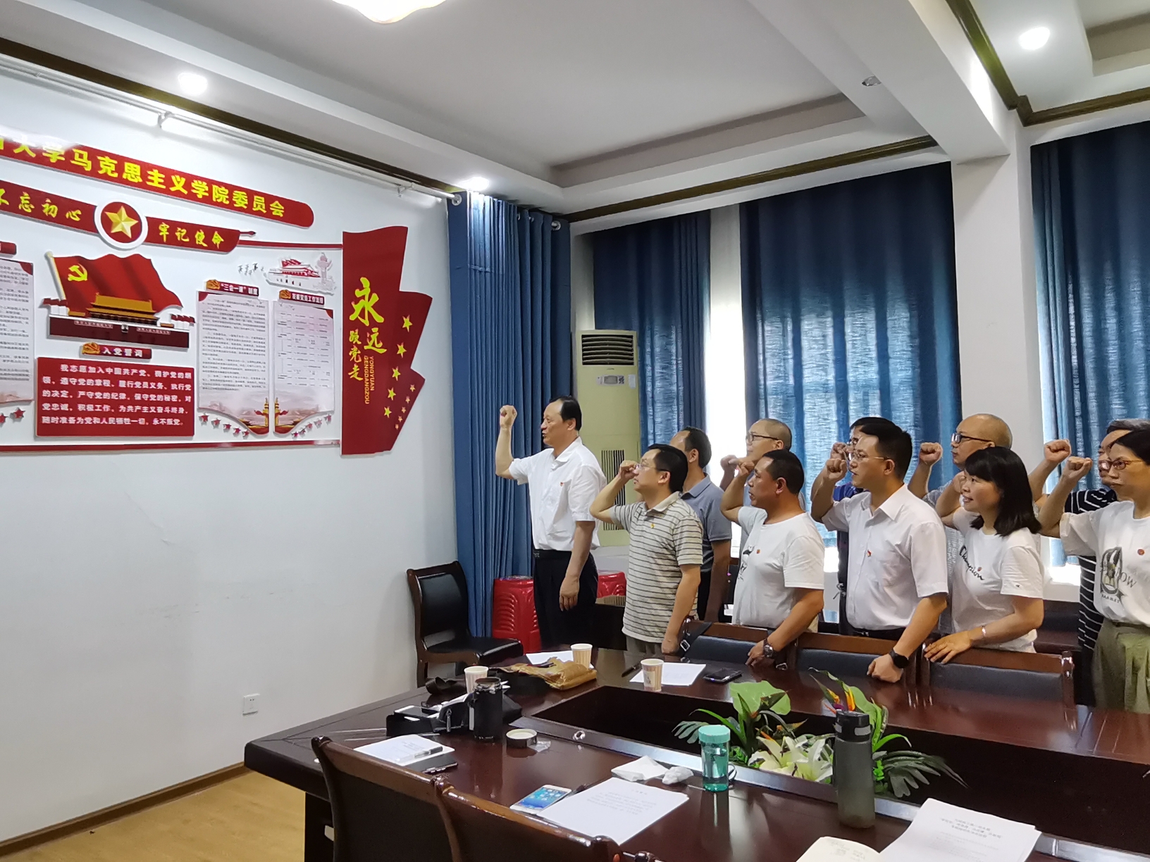 7月9日上午,学校党委书记白晋湘来到williamhill英国,参加了他所在支部(williamhill英国教工第一党支部)举行的“学党史、悟思想、办实事、开新局”专题组织生活会。在会上,白晋湘同志以一个普通党员的身份和支部全体党员一起,集中学习了习近平总书记在庆祝中国共产党成立100周年大会上的重要讲话,重温了入党誓词,听取了支部书记的述职报告,和支部党员们一起分享“七一讲话”学习心得,并就习近平总书记在七一庆祝大会上的重要讲话与williamhill英国的党员教师们进行研讨。白晋湘在会上还和其他党员一样,对照本次生活会的要求进行了批评和自我批评。