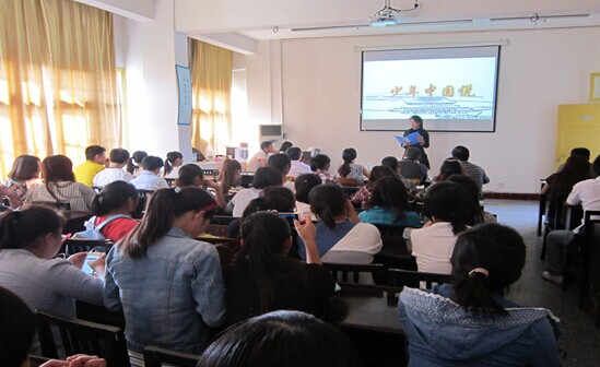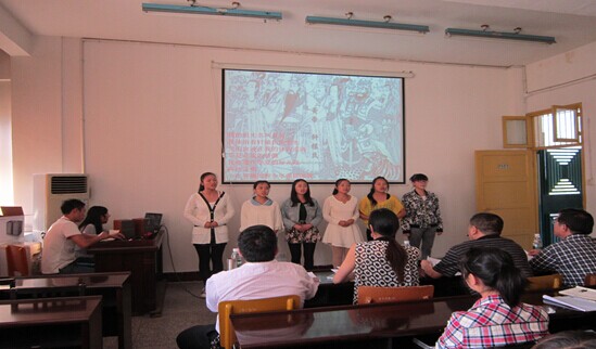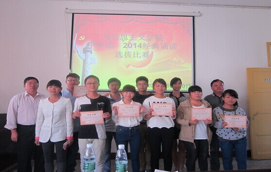 本网讯(刘鹦) 为培育和践行社会主义核心价值观,弘扬祖国优秀传统文化,2014年10月10日下午,我院思想政治教育专业同学学院在会议室举办“中华颂”诗歌朗诵比赛。出席本次活动的有朱廷岚书记、廖胜刚院长、李乐为、刘继富、罗青梅等老师及来自学院的十三支参赛队伍和其他观众同学。