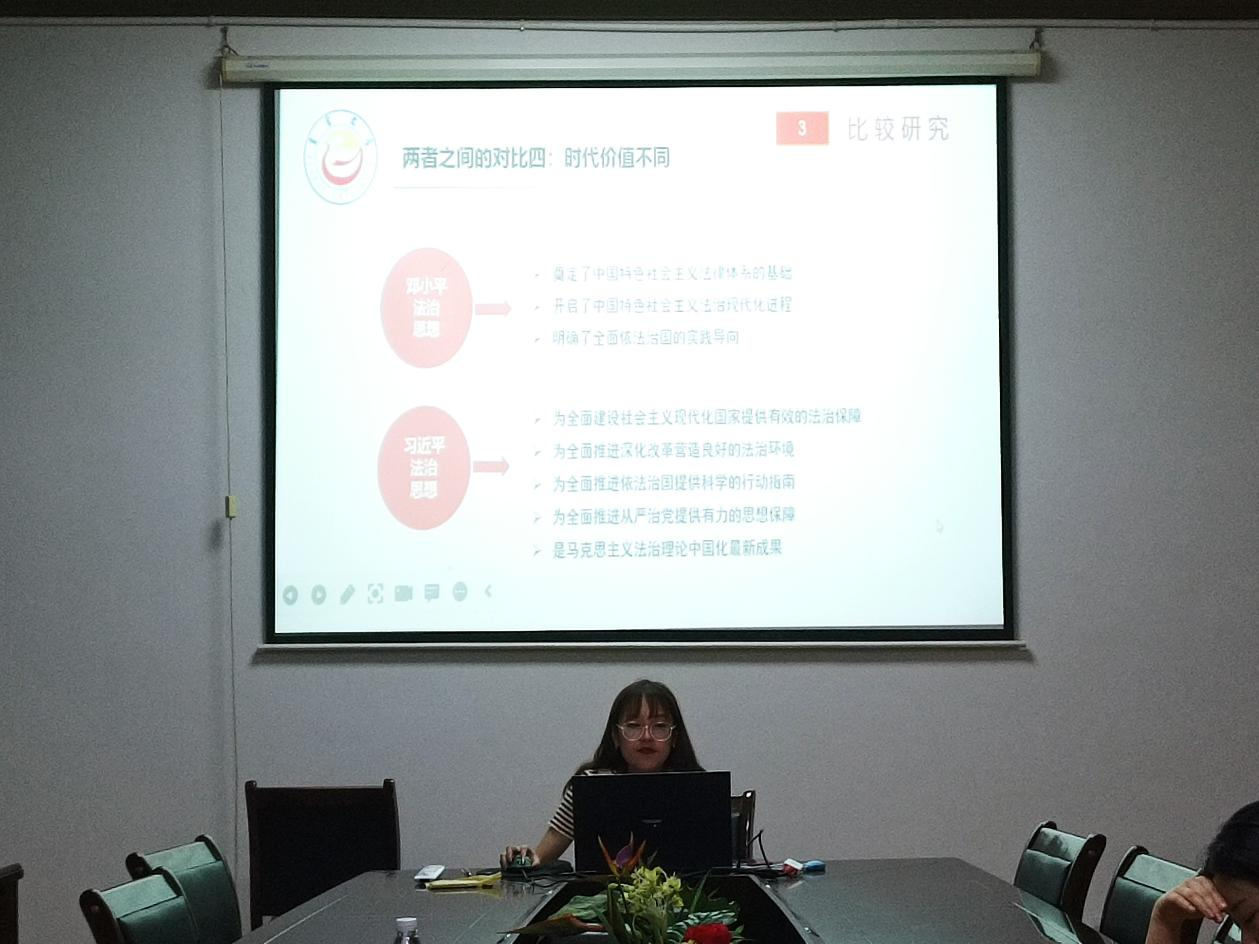 何佳宇以“邓小平与习近平法治思想比较研究述评”为题,从研究现状、研究述评、比较研究、发展方向四个方面进行了汇报。