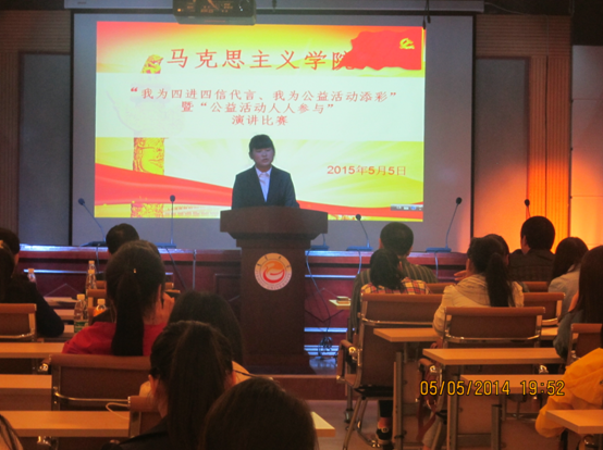 本网讯(书甜)5月5日晚19:10,我院在实验大楼南907举办“我为四进四信代言,我为公益活动添彩”演讲大赛。出席本次活动的有我院李乐为老师、刘继富老师、郑流云老师、罗青梅老师、学生干部及学院全体同学。演讲比赛中,张瑾的《将贡献写在公益的旗帜上》、石慧玲的《为你,千千万万遍》、邓梦桃《心若在,梦就在》、向华艳的《与公益同行》、黄旺的《微公益:爱,并快乐着》的演讲,主题明确、深刻,观点正确、鲜明;涉及材料真实、典型、新颖,并通过联系当代大学生生活,体现学习习近平总书记系列讲话精神。内容结构完整合理、层次分明,论点、论据具有逻辑性;构思巧妙,引人入胜。演讲者语音规范,表达自然流畅,具有感染力。在此次活动中,各位参赛选手都做了精心准备,展现了自己的学习风采,博得了观众们热烈的掌声。