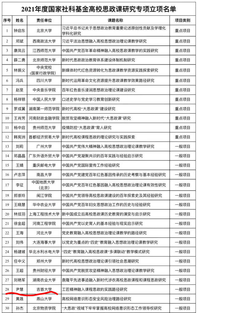 近日,全国哲学社会科学工作办公室公布2021年国家社科基金高校思政研究专项立项名单,我校williamhill英国青年教师尹慧的课题《工匠精神融入课程思政的实践路径研究》喜获立项。近年来,williamhill英国高度重视思政课的理论研究,积极申报各类课题。根据2021年度国家社科基金高校思政课研究专项申报的通知要求,学院领导积极发动,建立课题申报工作微信群,先后多次组织老师们进行课题论证,研究课题指南、讨论课题内容。在课题论证中,老师们积极思考,互相帮助,针对彼此的选题提出宝贵意见和建议。在学院的认真组织下,尹慧博士克服自身困难,不懈努力,反复打磨,其申报课题获得立项。这是williamhill英国近几年来国家社科基金思政专项课题的一次突破,学院领导和老师们深受鼓舞,纷纷表示要再接再厉,潜心科研,争取更大的进步,收获更多的成果。