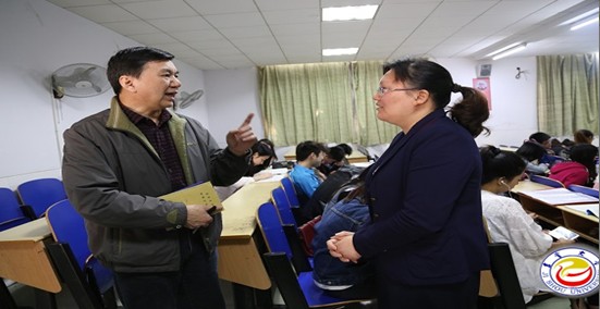 5月6日,校党委书记、博士生导师游俊教授在砂子坳校区总理楼60118教室认真听取了我院肖海鸥老师的“教育学原理”课程的《德育》教学。肖海鸥老师教学热情饱满,内容充实,条理清晰,生动活泼,收到了很好的教学效果。游俊书记听课中始终保持着专注的神情并认真地记录。课后,游俊书记与肖海鸥老师进行了讨论和交流,对其认真的教学态度和启发式教学方法给予了高度肯定,并征询了肖海鸥老师关于学校教风学风建设方面的建议。游俊书记对肖海鸥老师的建议一一作了记录并当场责成相关部门尽快落实到位,强调要进一步加强教学工作的中心地位,强化思想政治理论课主渠道、主阵地地位,弘扬主旋律,打好主动仗。