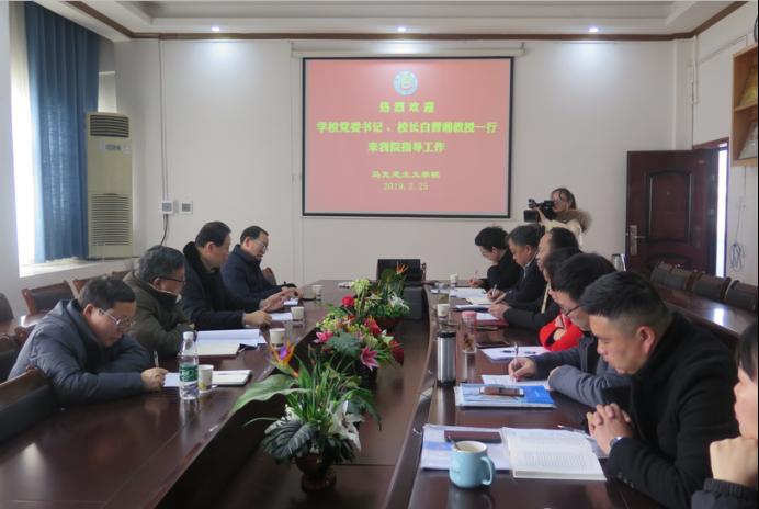 本网讯(文/吕娟萍)开学伊始,为更好地推进学院新学期各项工作,2月25日下午,校党委书记、校长白晋湘教授带领教务处处长庹清、党委宣传部副部长李洪雄、党委组织部李景军(党校副校长)来学院检查指导工作。此次白书记一行专程来院指导教学成果奖申报工作。院党委书记戴林富、副院长肖映胜及廖金香、吴恒同、段荣老师参会。会议由廖胜刚院长主持。