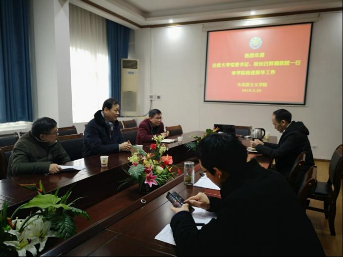 本网讯(文/郑宁宁)2月20日,校党委书记、校长白晋湘、教务处处长庹清、教科院院长蒋林一行前往我院检查指导工作。我院院长廖胜刚、党委书记戴林富、副院长肖映胜出席会议。