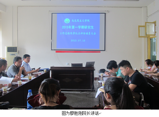 廖胜刚院长首先回顾总结了2015年研究生招生复试、2014级研究生专业课程的学习、研究生德育实践项目和科研项目立项、参加学术会议、2013级研究生中期考核、2015届研究生毕业论文答辩、研究生评优评奖荣获各项荣誉以及学科建设方面修订了马克思主义理论学科人培养方案、制定了马克思主义理论学科“十三五”规划等工作。廖院长对本学期辛勤工作的导师们表示由衷感谢并致以崇高敬意。他说,质量是研究生教育的生命线,国家建立研究生质量信息平台等举措对研究生教育质量提出了更高更明确的要求,要更加重视构建符合教育规律、适应发展需要、具有马克思主义理论学科特色质量监督保证体系。廖院长说,当前学院研究生教育教学工作突出应用型人才培养,以应用型人才培养目标为主线,从学科的办学定位、指导思想等顶层设计,到师资队伍建设、教学基本建设、学科专业建设、人才培养方案、实践教学体系和质量保障体系建设,一以贯之地推进内涵式发展道路。对照学位办合格评估指标要求,我们深刻地认识到,研究生教育教学工作距离学校“先进”要求还存在着一定的差距。主要体现在:师资队伍数量不足,学科专业之间不平衡,缺乏高水平带头人;学科优势和专业特色不突出;科研意识强但科研水平不高,产学研对应用型人才培养的支撑力度不够;学术风气不够浓厚,教风引领学风、学风促进校风的良性机制没有完全形成,研究生主动学习意识不强、动力不足、目标不明。学院将进一步加强研究生高层次人才培养工作,开拓创新,着力解决研究生教育管理工作中存在的问题。